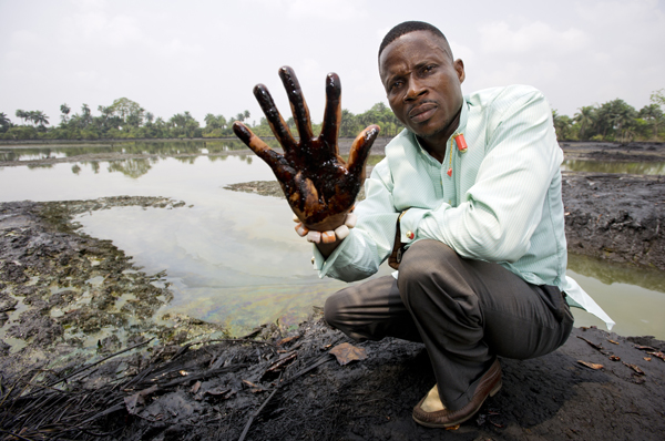 GOI – Eiser Eric Dooh toont de ruwe olie die de oevers van de kreek door zijn dorp Goi (Ogoniland) heeft aangetast. Meerdere lekkages in een pijpleiding van Shell hebben de kreek over een lengte van vele kilometers zwaar verontreinigd, waardoor vis en ander leven uit het getijdengebied zijn verdwenen.